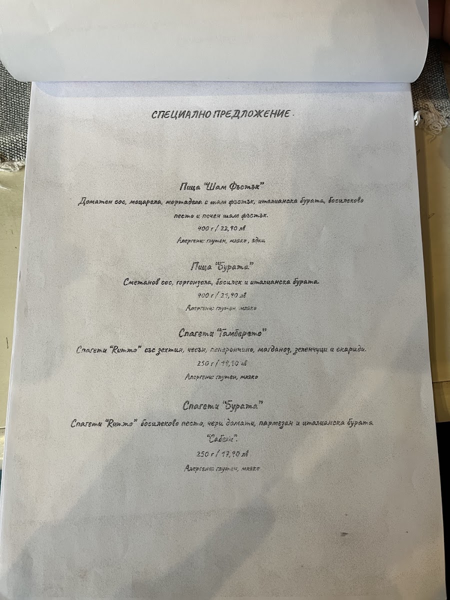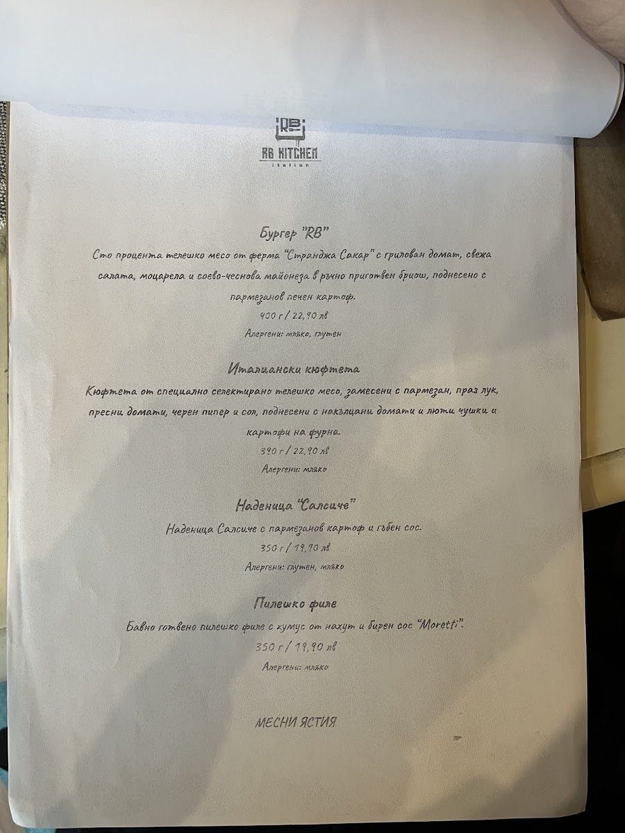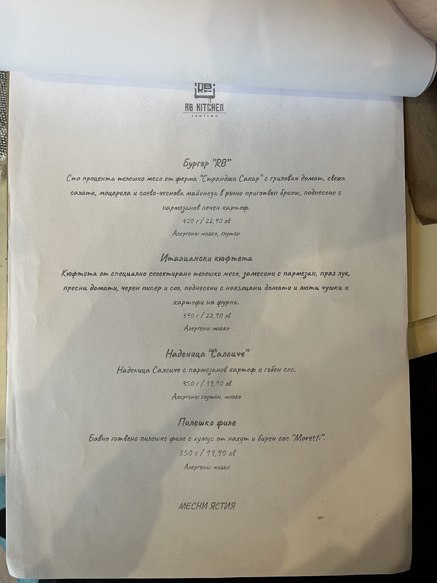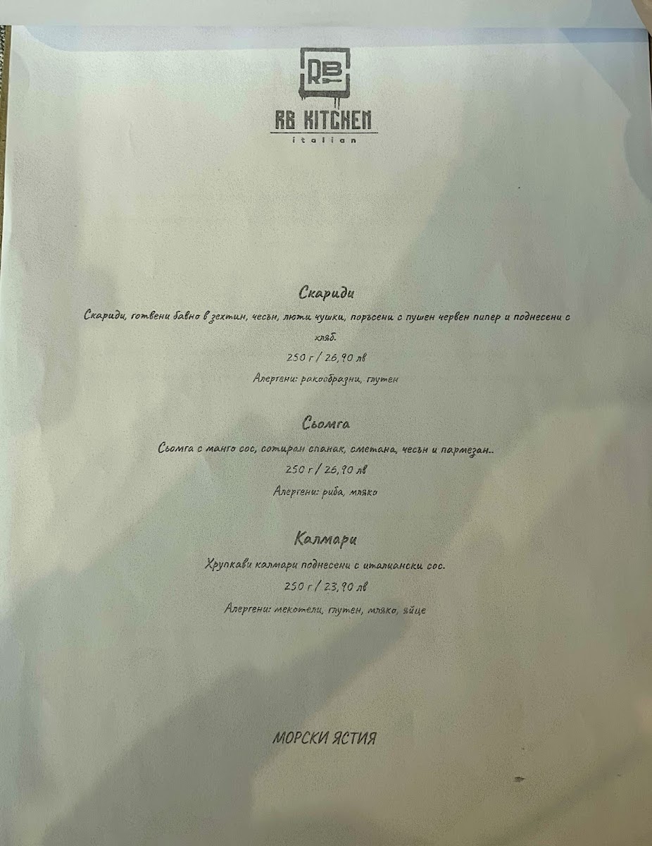 From a reviewer’s perspective, the menu at Rb Kitchen - Italian offers a compact but appealing selection that blends seafood, desserts, and sharing plates with value-focused combo options. Highlights include the seafood dish Пъстърва and the well-portioned Калмари (250г), which are great choices for seafood lovers, while the classic dessert Тирамису (150г) provides a traditional Italian finish to the meal. For starters or sharing, the Брускети (200г) and Плато Сирена И Колбаси (300г) are ideal for the table and pair well with drinks. The restaurant also stands out for its combo deals, such as 2 Пици Или 2 Пасти + 2 Напитка, Пица+Паста+Бургер+3 Бири Морети, and Пица+Паста2 Пасти И Чеснова Пица Али Олио, which offer good variety and value, especially for groups. Overall, the menu is not overly large, but the combination meals and classic Italian selections make it satisfying and practical, particularly for diners looking for variety at a reasonable price.